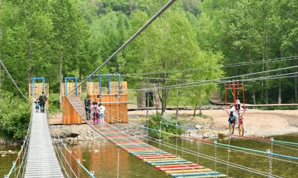 為了讓游客游客擁有更加豐富多元的游玩體驗,原始林景區(qū)在今年精心打造了多個特色項目。“松屬”露營地完美融合了迷人的自然美景、完備的設(shè)施以及舒適的體驗,成為自駕愛好者露營的絕佳之選;低空小纜車運行平穩(wěn),乘坐其中穿梭于山林之間,能夠以獨特視角近距離欣賞秀美風(fēng)光;挑戰(zhàn)橋橫跨河流之上,每邁出一步,橋體都會隨之晃動,帶來心跳加速的刺激體驗;高空自行車極具挑戰(zhàn)性與趣味性,讓游客在感受空中與河流雙重刺激的同時,與綠水青山親密相擁。此外,樹屋滑梯、松果迷宮、昆蟲觀察站等項目深受孩子們喜愛,他們在盡情玩耍的過程中,還能學(xué)習(xí)森林生態(tài)知識,培養(yǎng)對大自然的熱愛之情。